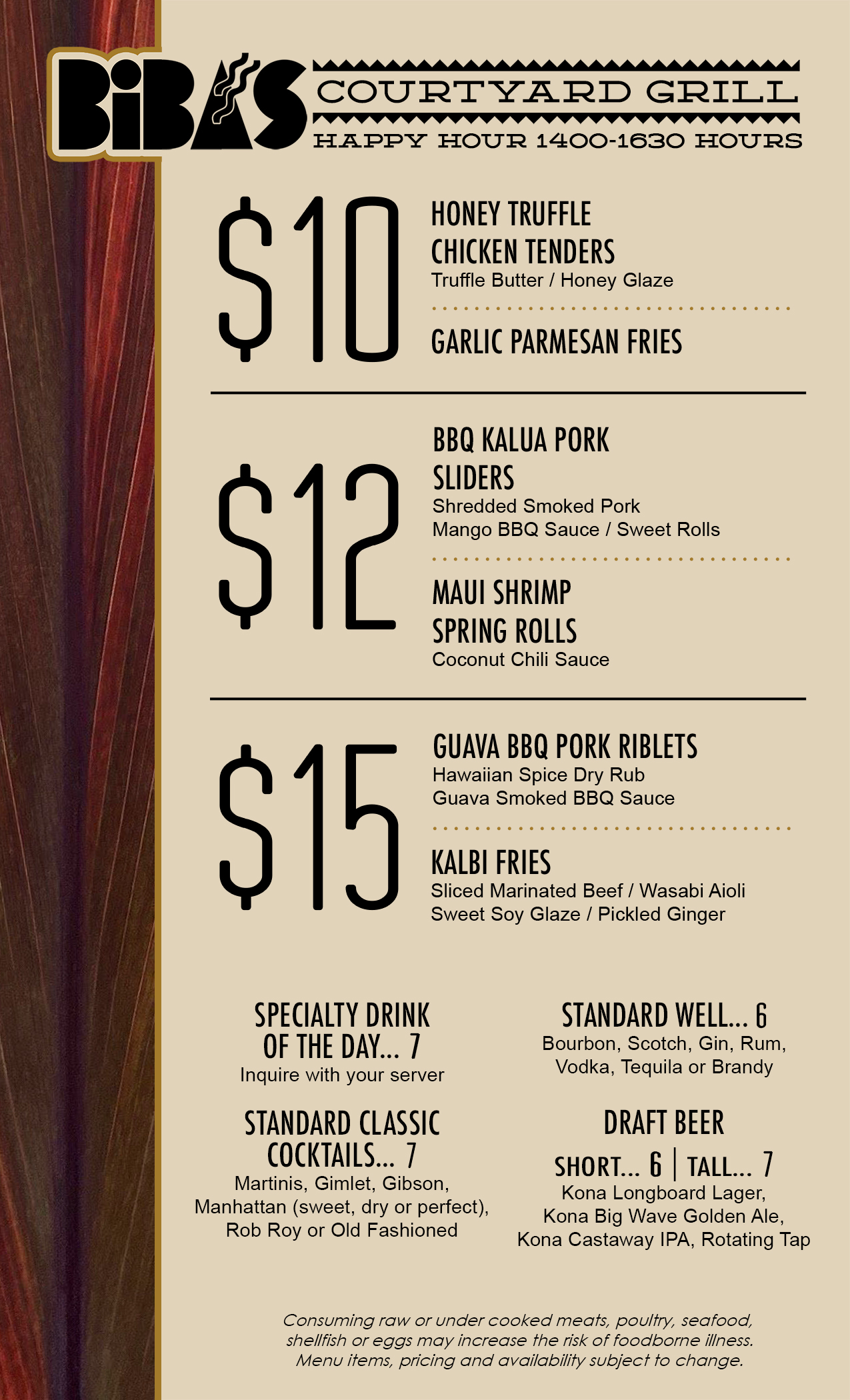 Bibas Courtyard Grill Directions Menu | Mon, Tue, Wed, Thu, Fri, Sat, Sun | 2:00 pm – 4:30 pm Ended | $6 wells $6 draft beers $7 specials $7 cocktails $10 chicken tenders $12 kalua pork sliders and shrimp spring rolls $15 Kalbi fries or guava pork riblets | Waikiki |